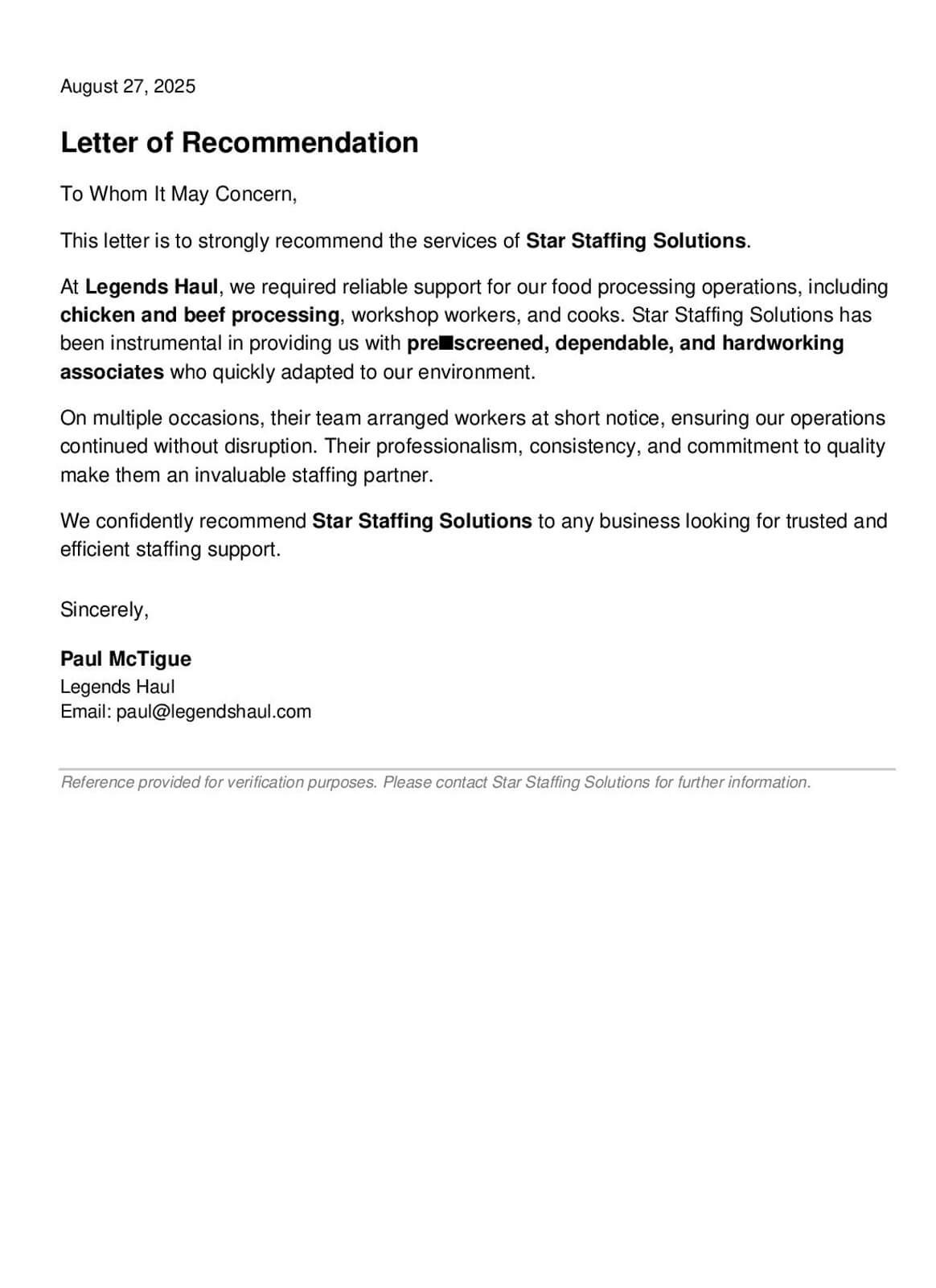 “We rely on Star Staffing Solutions every season for additional staff in our food packaging facility. The workers are punctual, professional, and well-trained. Their support helps us maintain smooth operations during peak demand.”